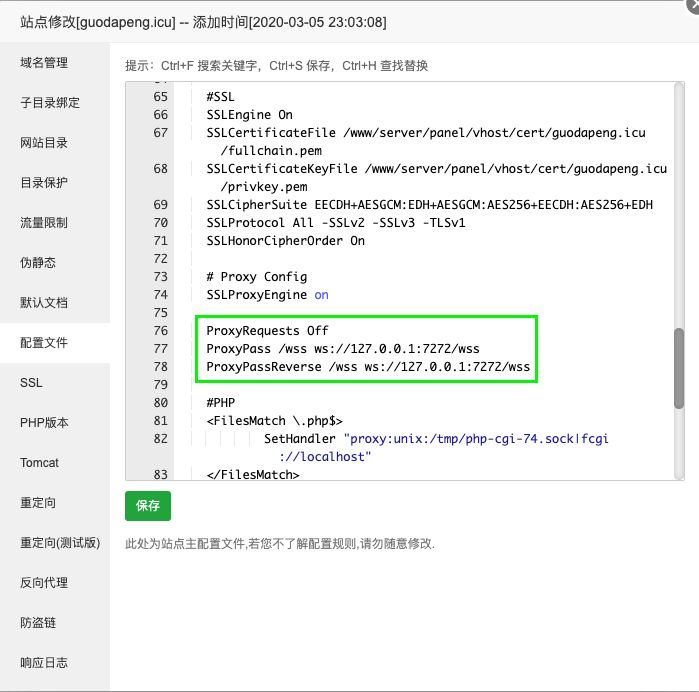 ProxyPassReverse /wss ws://127.0.0.1:7272/wss